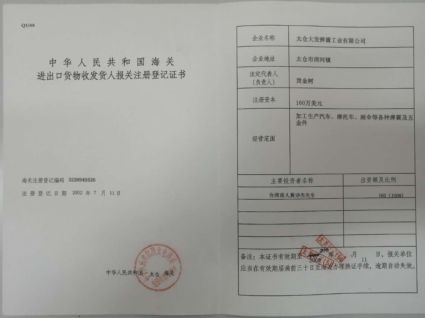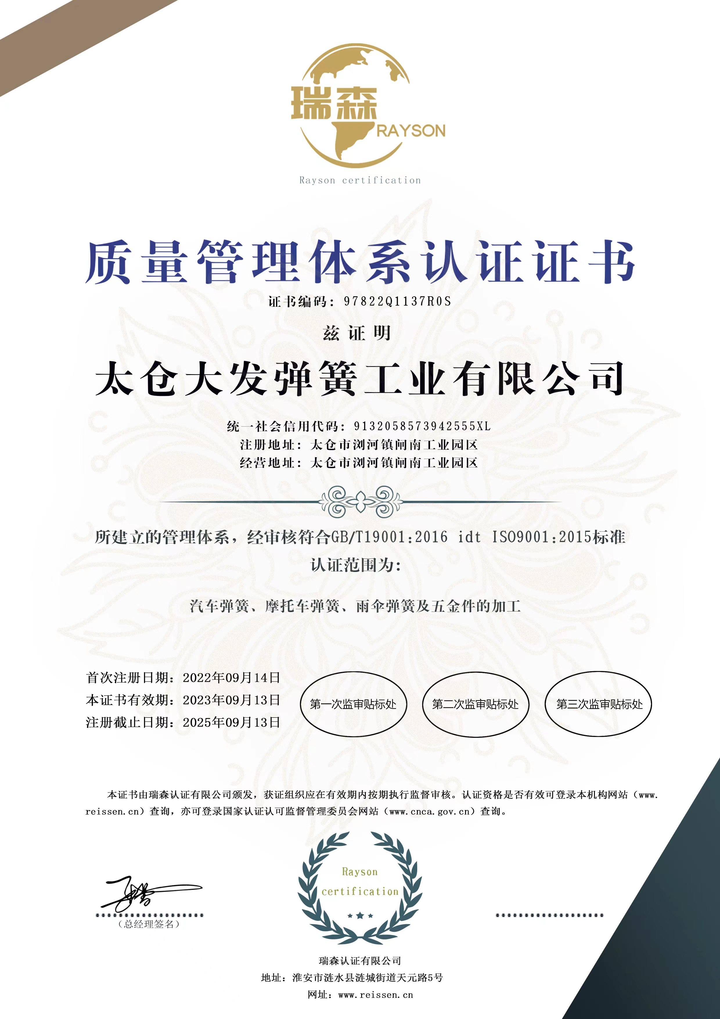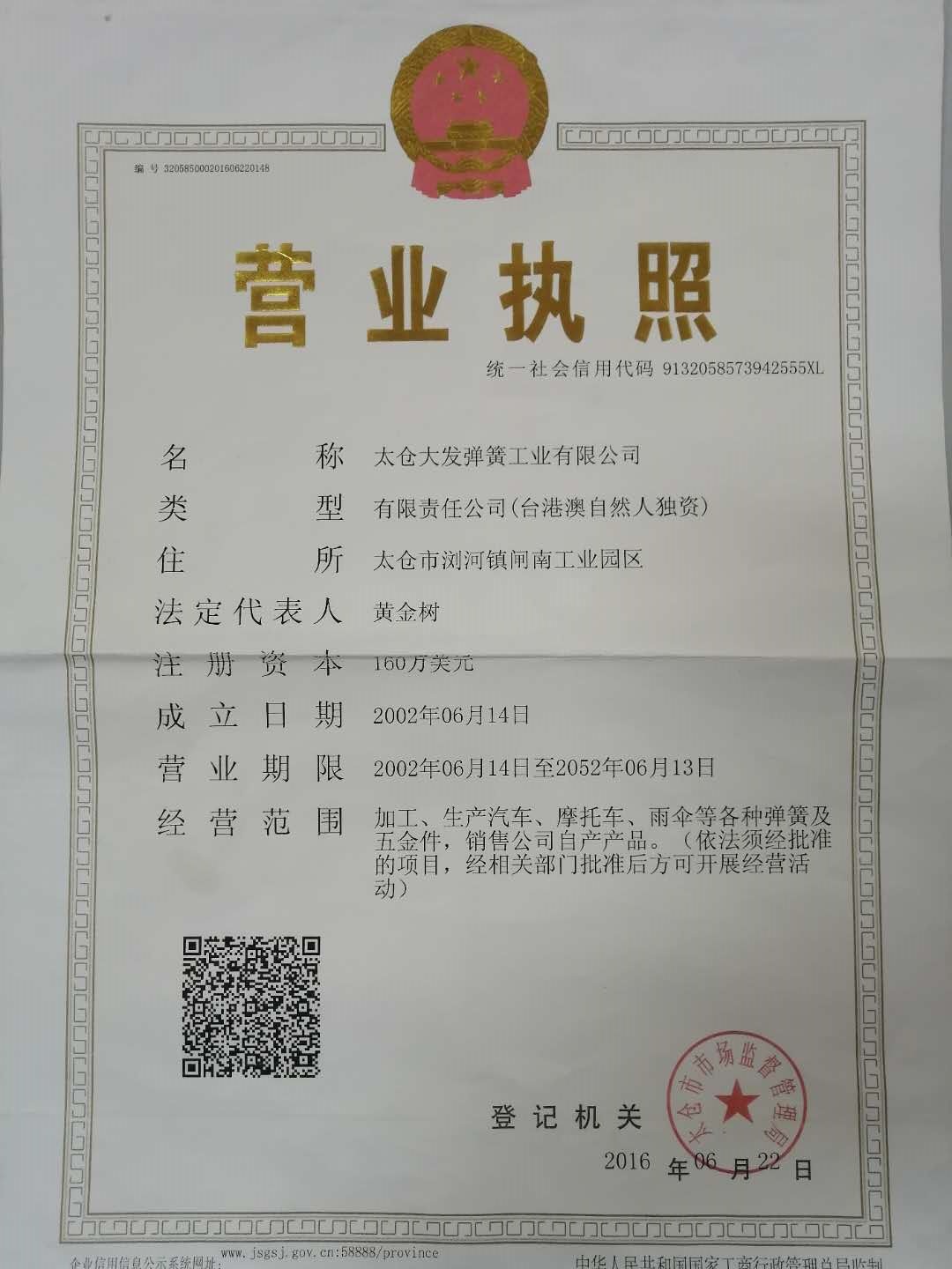 太倉大發(fā)彈簧工業(yè)有限公司由黃金樹先生于1967年始創(chuàng)于臺灣,是一個(gè)集雨傘、電子、五金機(jī)械、自行車、摩托車、汽車等的彈簧配件生產(chǎn)、加工、輔助設(shè)計(jì)服務(wù)的綜合性企業(yè),其中1990年創(chuàng)辦的廈門大發(fā)彈簧公司、2000年創(chuàng)辦的深圳大發(fā)彈簧公司、2002年創(chuàng)辦的太倉大發(fā)彈簧公司均位于經(jīng)濟(jì)發(fā)展地區(qū),地理位置佳。我們憑借在彈簧制造業(yè)的多年豐富知識與技術(shù),并著眼于以客戶為導(dǎo)向,秉持“以人為本,以質(zhì)為先,以客為主,持續(xù)創(chuàng)新”的經(jīng)營理念,強(qiáng)化競爭優(yōu)勢。公司導(dǎo)入ISO9001: 2000質(zhì)量管理體系,執(zhí)行ISO14000:2000管理方式,倡導(dǎo)安全、高質(zhì)量、高素質(zhì)的生產(chǎn)。
